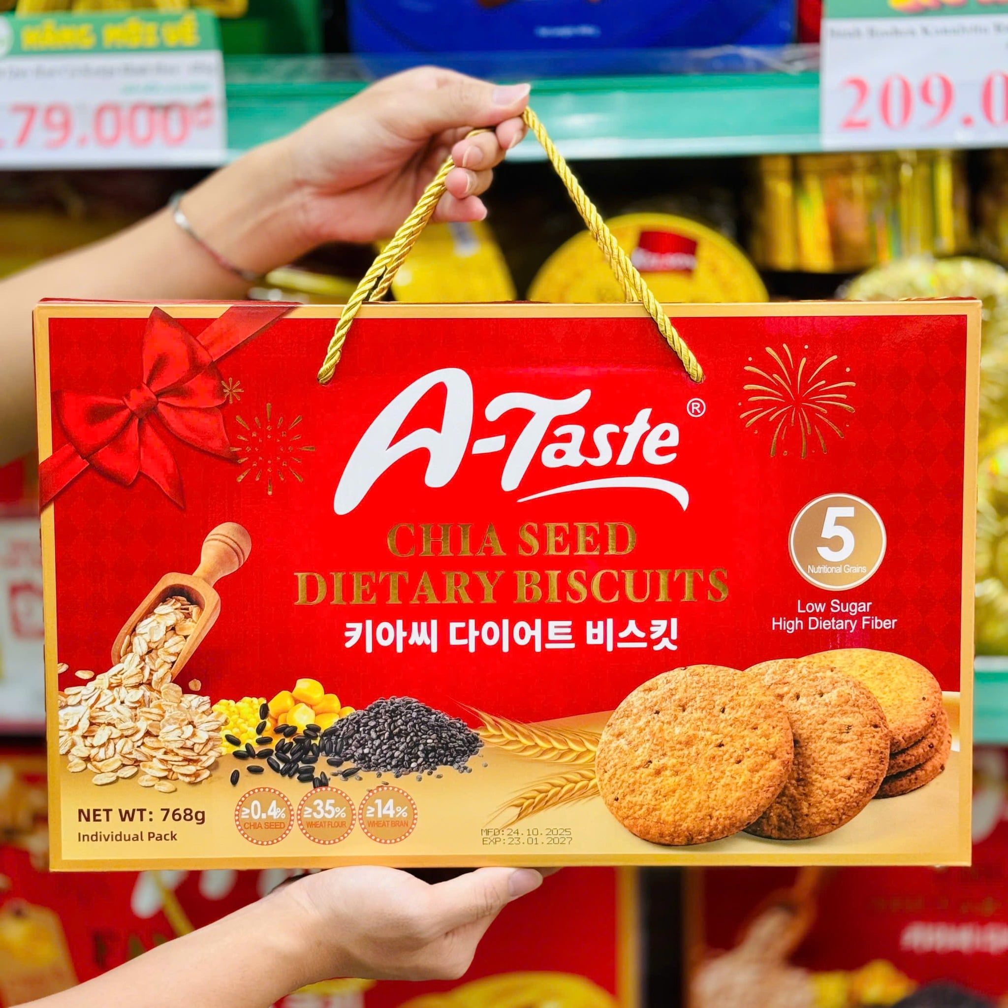 Bánh Quy Bơ A-Taste Cao Cấp - 765g là dòng bánh quy bơ cao cấp được ưa chuộng trong những mùa Tết gần đây. Với hương vị bơ thơm béo đặc trưng, bánh giòn tan vừa miệng, sản phẩm mang đến cảm giác thưởng thức trọn vẹn và tinh tế cho những buổi sum họp đầu xuân.