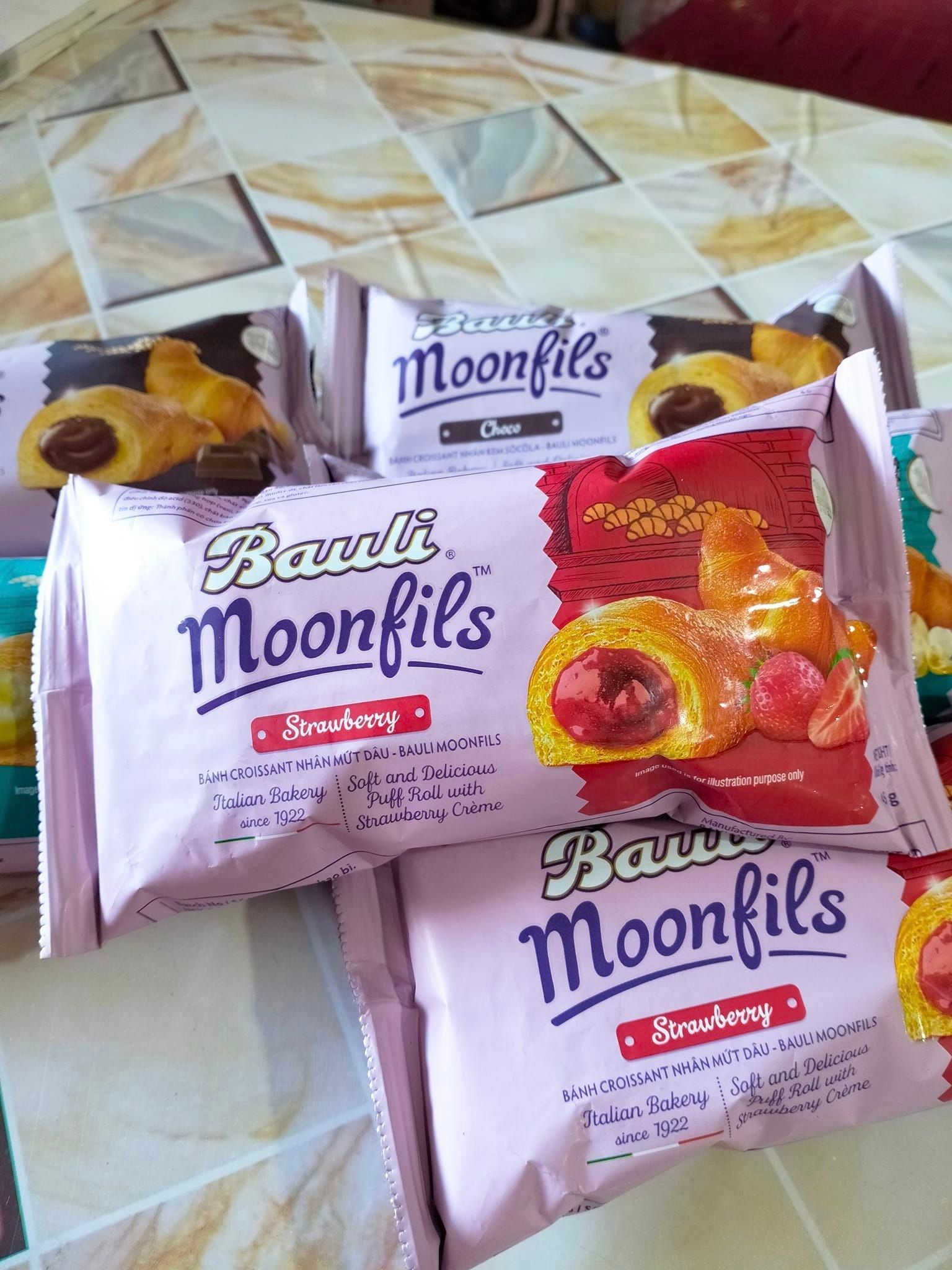Bánh sừng trâu Bauli Moonfils được làm theo công thức chuẩn Ý, với lớp vỏ mềm xốp, thơm bơ hòa quyện cùng nhân kem ngọt ngào. Sản phẩm mang đến nhiều lựa chọn hương vị như dâu ngọt dịu, socola đậm đà và vani thơm béo, phù hợp cho cả người lớn lẫn trẻ em. Đây là món bánh tiện lợi để dùng trong bữa sáng, bữa xế hay mang theo khi đi làm, đi học, du lịch.