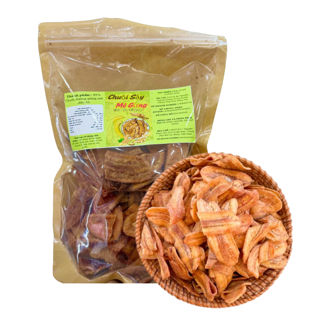 Chuối Sấy Mè Gừng SUSU là sự kết hợp độc đáo giữa chuối xiêm chín cây, mè rang bùi béo và gừng thơm cay nhẹ. Sản phẩm mang đến hương vị dân dã nhưng mới lạ, vừa ngon miệng vừa tốt cho sức khỏe. Với gói 500g tiện lợi, đây là lựa chọn tuyệt vời để làm món ăn vặt cho cả gia đình hoặc biếu tặng.