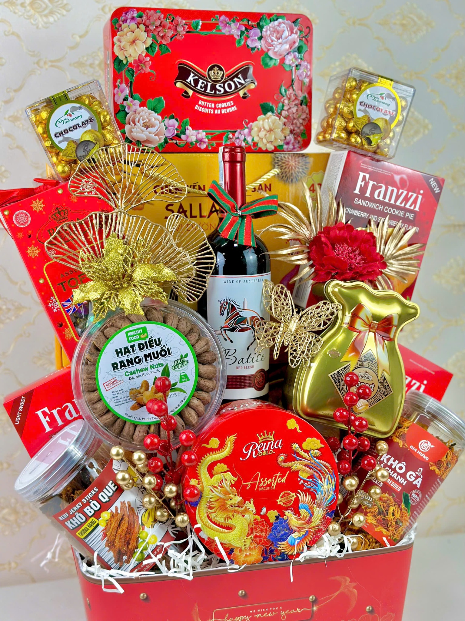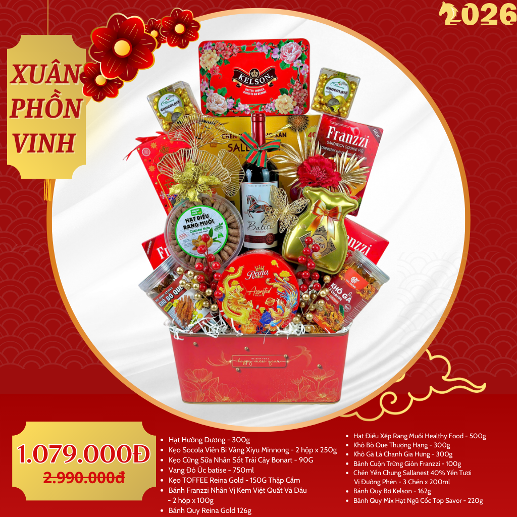 Giỏ Quà Tết Cao Cấp 2026 – Xuân Phồn Vinh là biểu tượng của một mùa xuân đủ đầy, mang lời chúc phồn thịnh – may mắn – tài lộc đến gia đình, đối tác và khách hàng. Set quà được tuyển chọn từ các sản phẩm cao cấp, hương vị đa dạng, vừa sang trọng vừa tinh tế, thích hợp làm quà biếu Tết 2026.