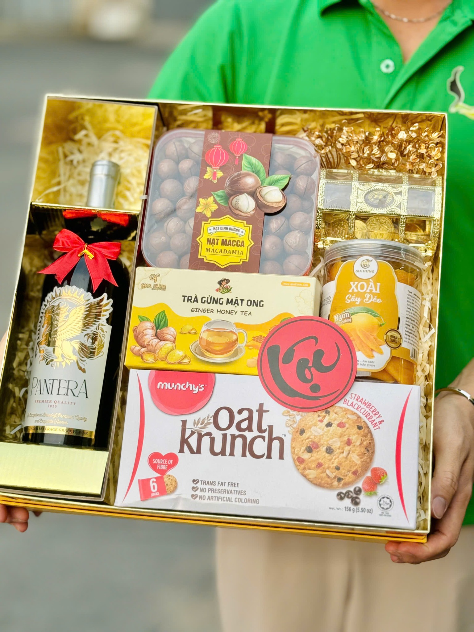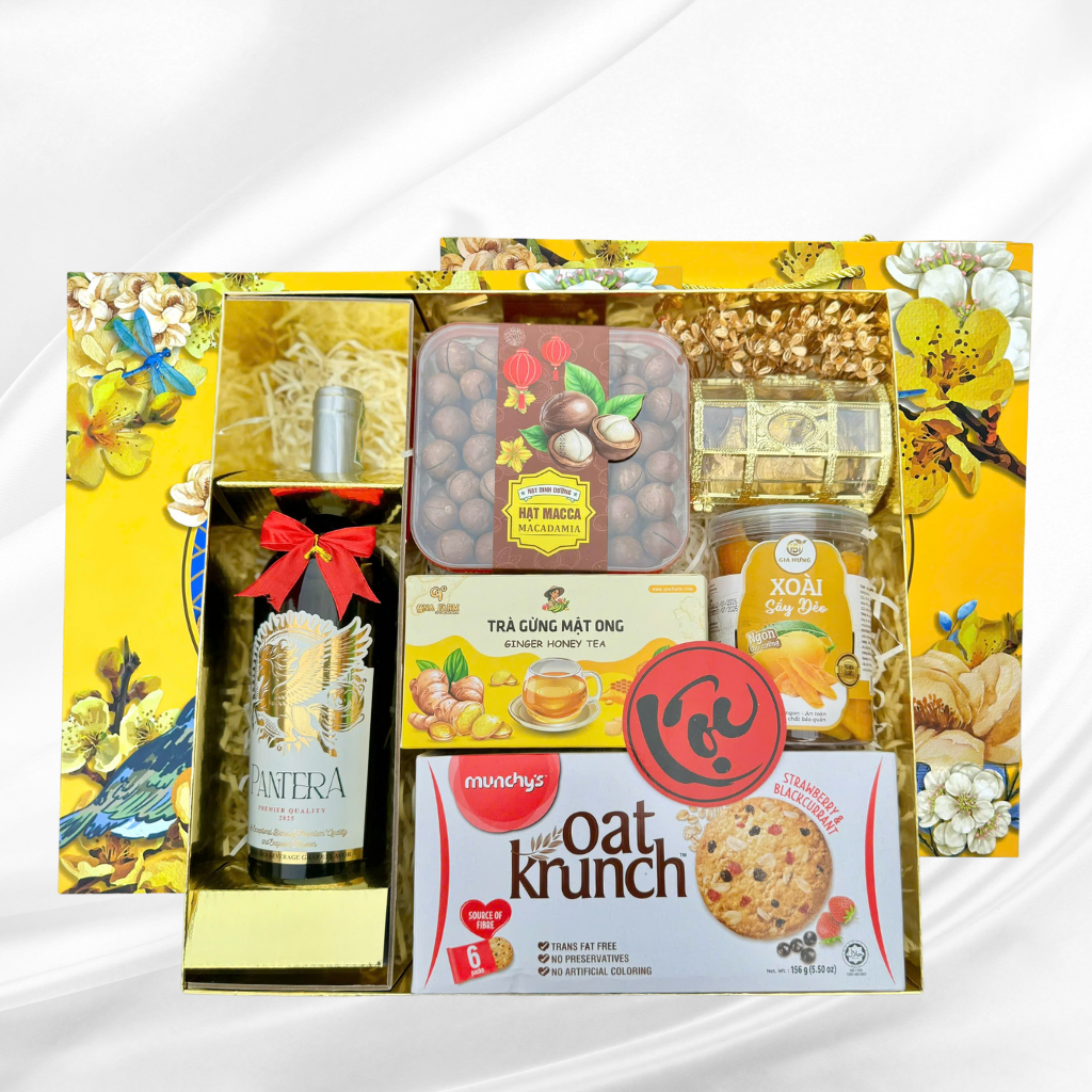 Hộp quà nổi bật với tone vàng chủ đạo, biểu trưng cho sự thịnh vượng, giàu sang và cát khí đầu xuân. Thiết kế hộp cứng cao cấp, họa tiết sang trọng, bố cục sắp xếp gọn gàng và bắt mắt. Tổng thể hộp quà tạo cảm giác chỉn chu, đẳng cấp, phù hợp làm quà biếu Tết 2026 cho gia đình, sếp, khách hàng VIP hoặc đối tác kinh doanh.