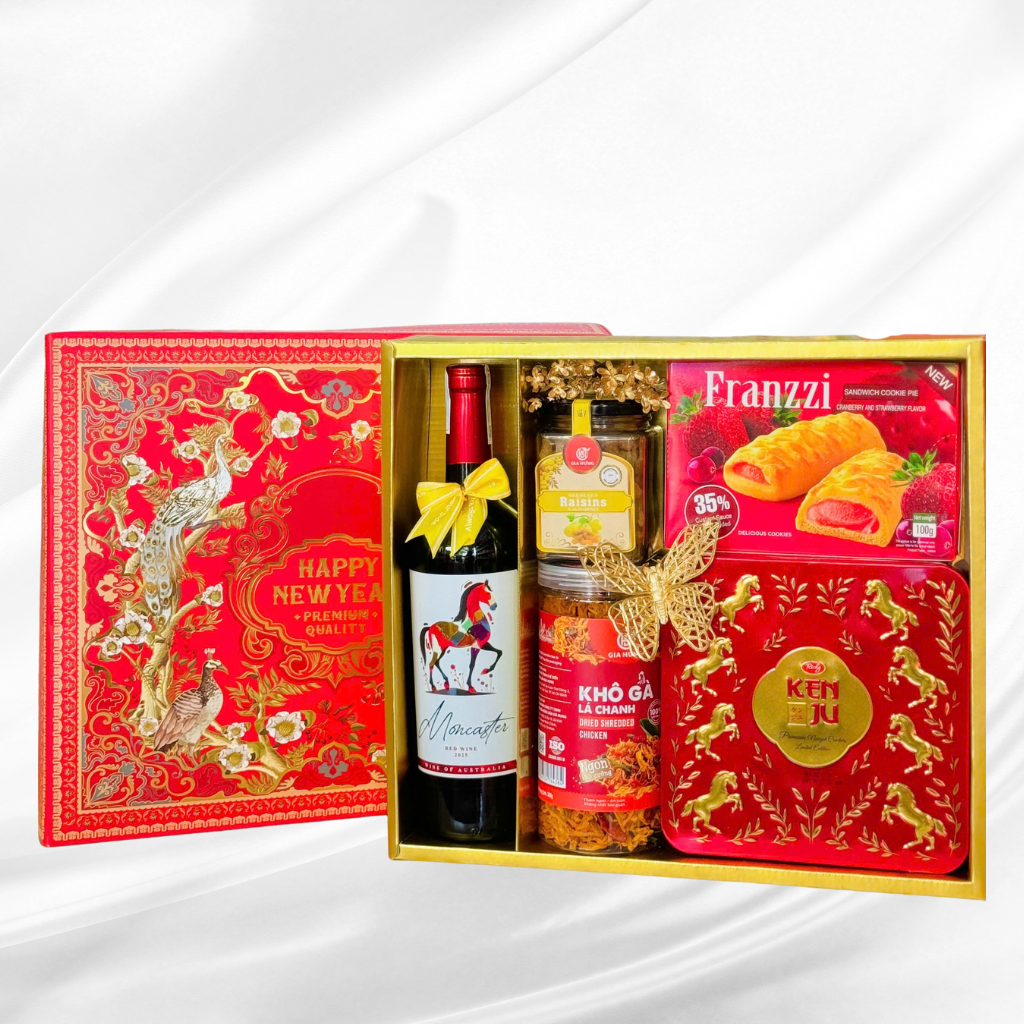 Hộp quà được thiết kế gọn gàng, tinh tế và sang trọng, kết hợp hài hòa giữa thực phẩm chọn lọc và bánh kẹo cao cấp. Đây là lựa chọn quà biếu trang nhã dành cho người thân, bạn bè, khách hàng và doanh nghiệp trong dịp Tết Nguyên Đán 2026.