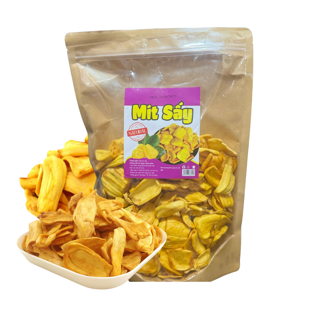 Mít Sấy Giòn - 500gr được làm từ những múi mít tươi chín cây, qua công nghệ sấy hiện đại giúp giữ nguyên màu sắc vàng ươm, hương vị ngọt bùi và độ giòn rụm đặc trưng. Đây là món ăn vặt tự nhiên, không chỉ ngon miệng mà còn giàu chất xơ, vitamin và khoáng chất, tốt cho sức khỏe. Thích hợp cho cả gia đình cùng thưởng thức hoặc làm món quà biếu ý nghĩa.