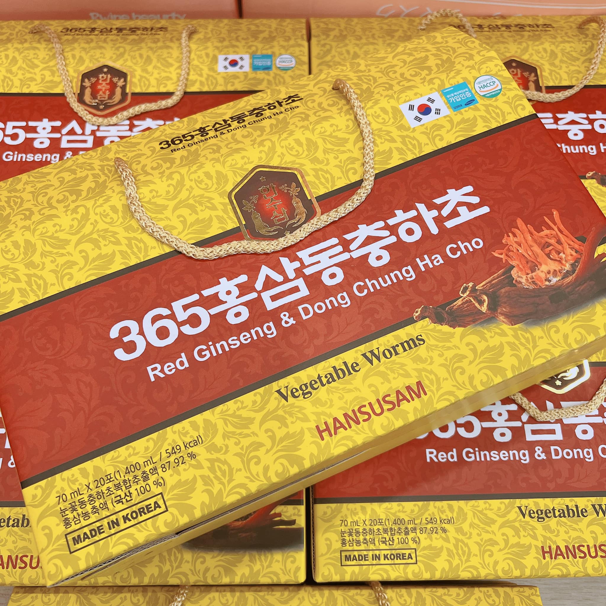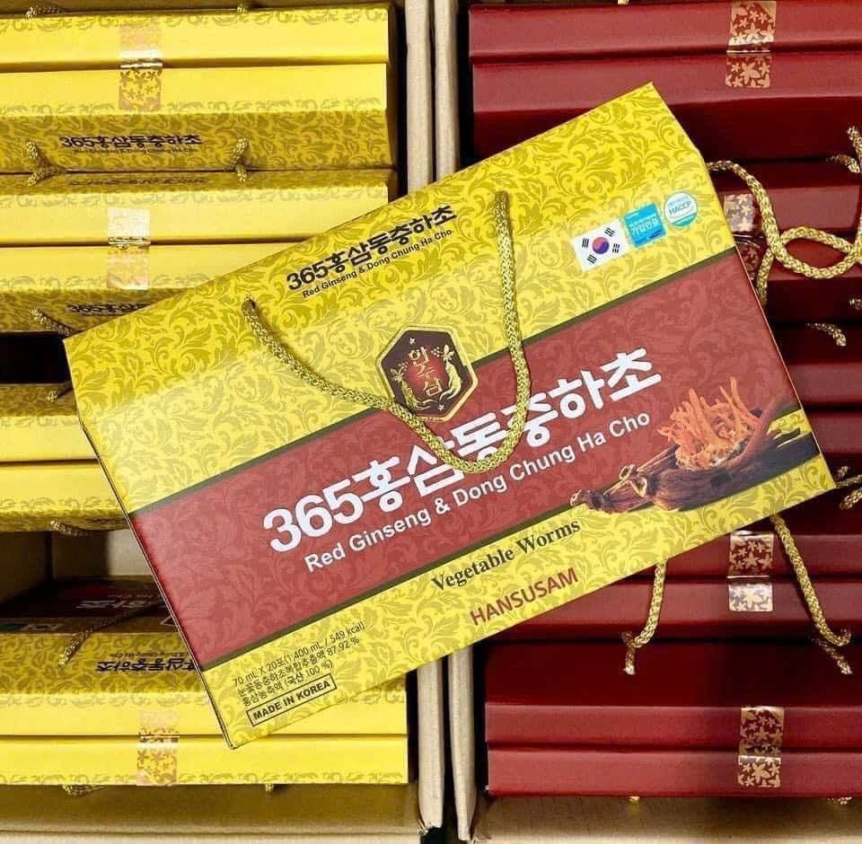 Nước Hồng Sâm Đông Trùng 365 là sự kết hợp hài hòa giữa hồng sâm Hàn Quốc 6 năm tuổi và đông trùng hạ thảo, mang đến hương vị thơm dịu, dễ uống và giàu dinh dưỡng. Sản phẩm được đóng gói tiện lợi, thích hợp dùng hàng ngày và làm quà biếu sang trọng.