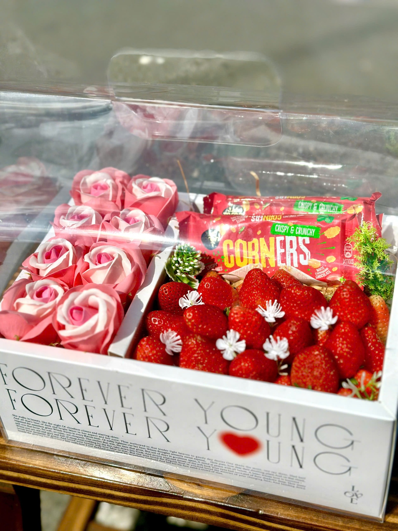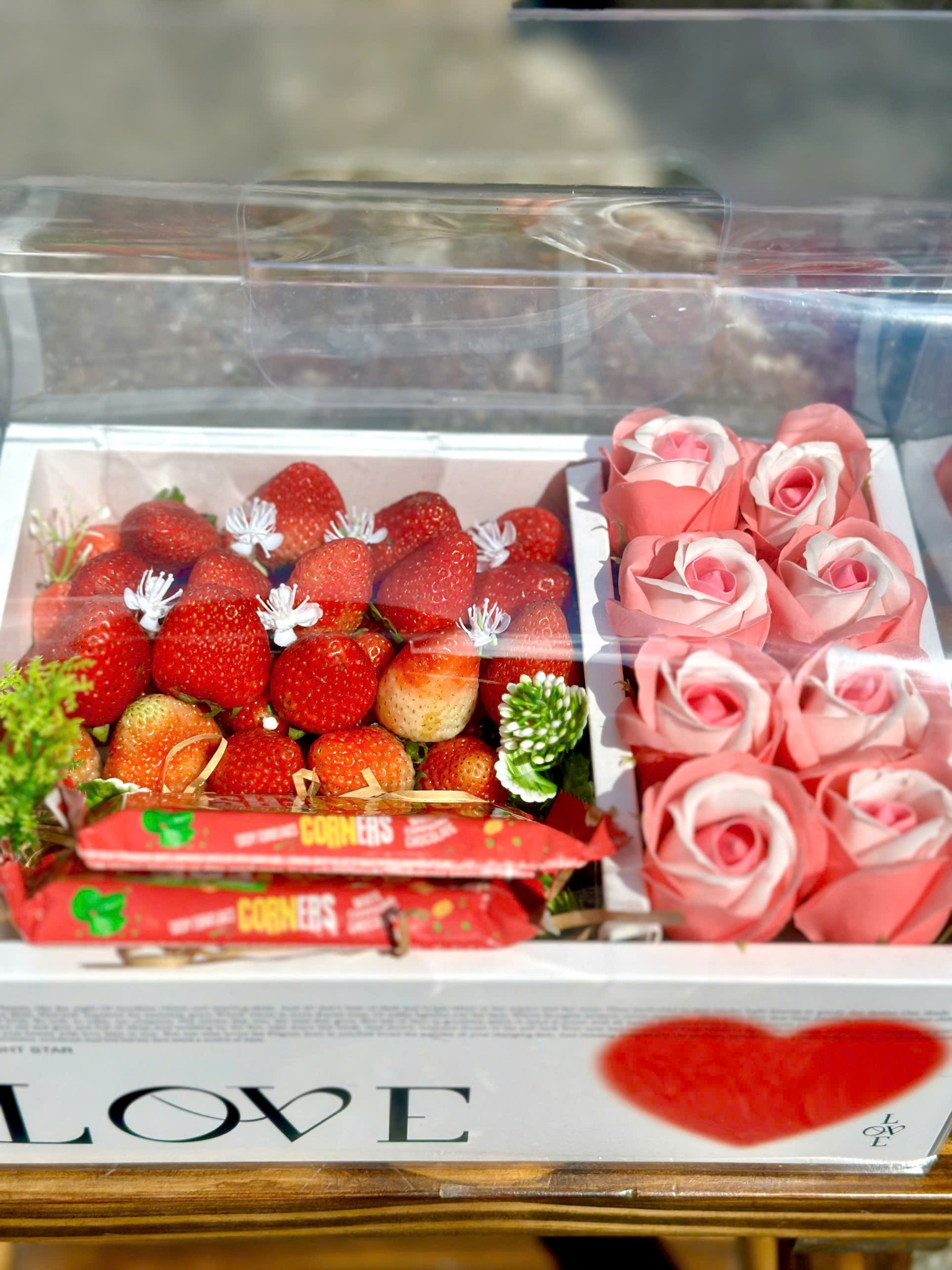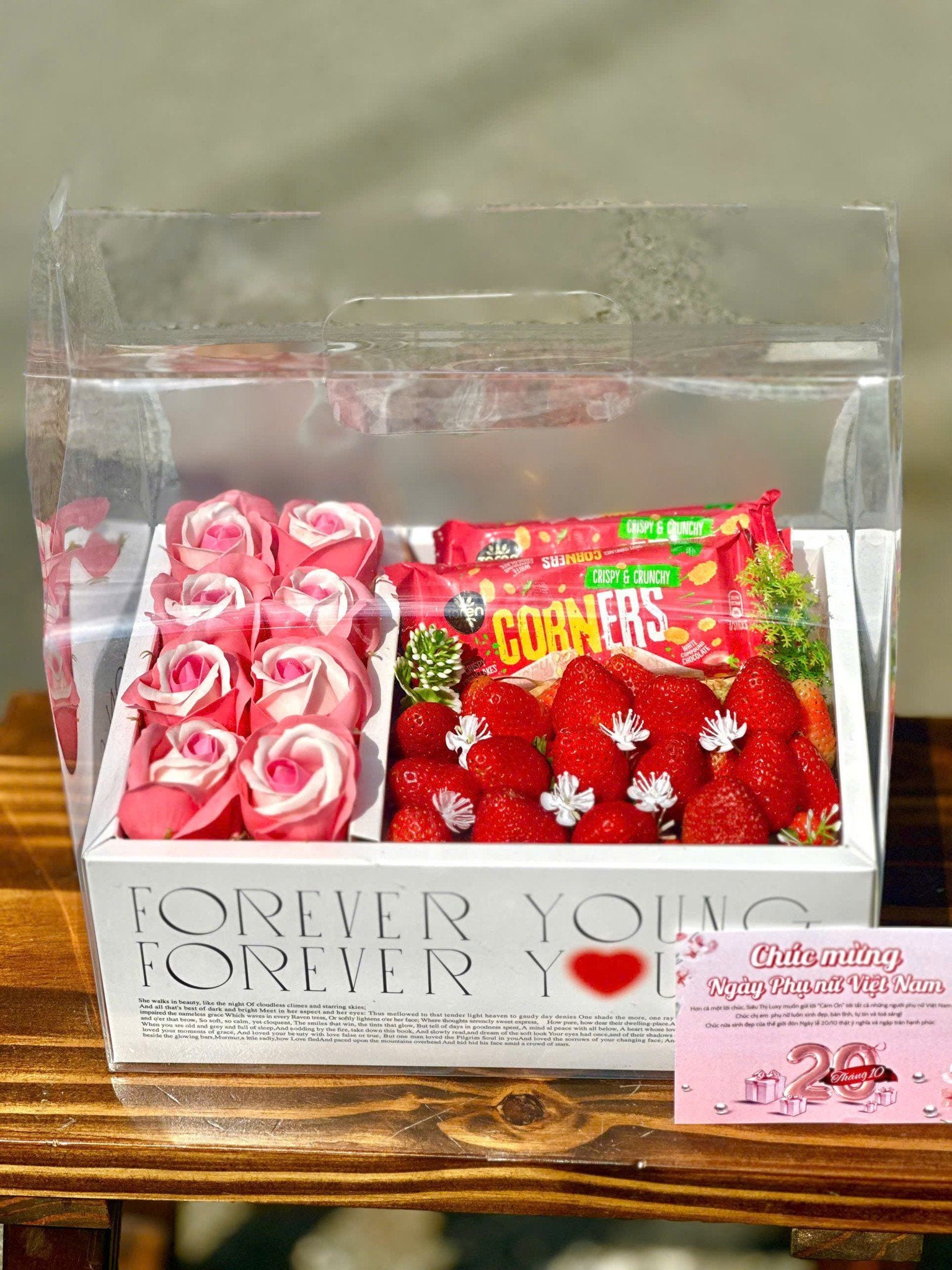 Set Quà Tặng 20/10 - Set 52 là sự kết hợp tinh tế giữa dâu tây tươi mọng nước và thanh socola Corners nhân dâu thơm béo, mang đến món quà vừa ngọt ngào vừa sang trọng cho ngày Phụ Nữ Việt Nam. Đây là lựa chọn hoàn hảo dành cho những ai muốn gửi lời chúc yêu thương và trân trọng đến người phụ nữ mình quý mến.