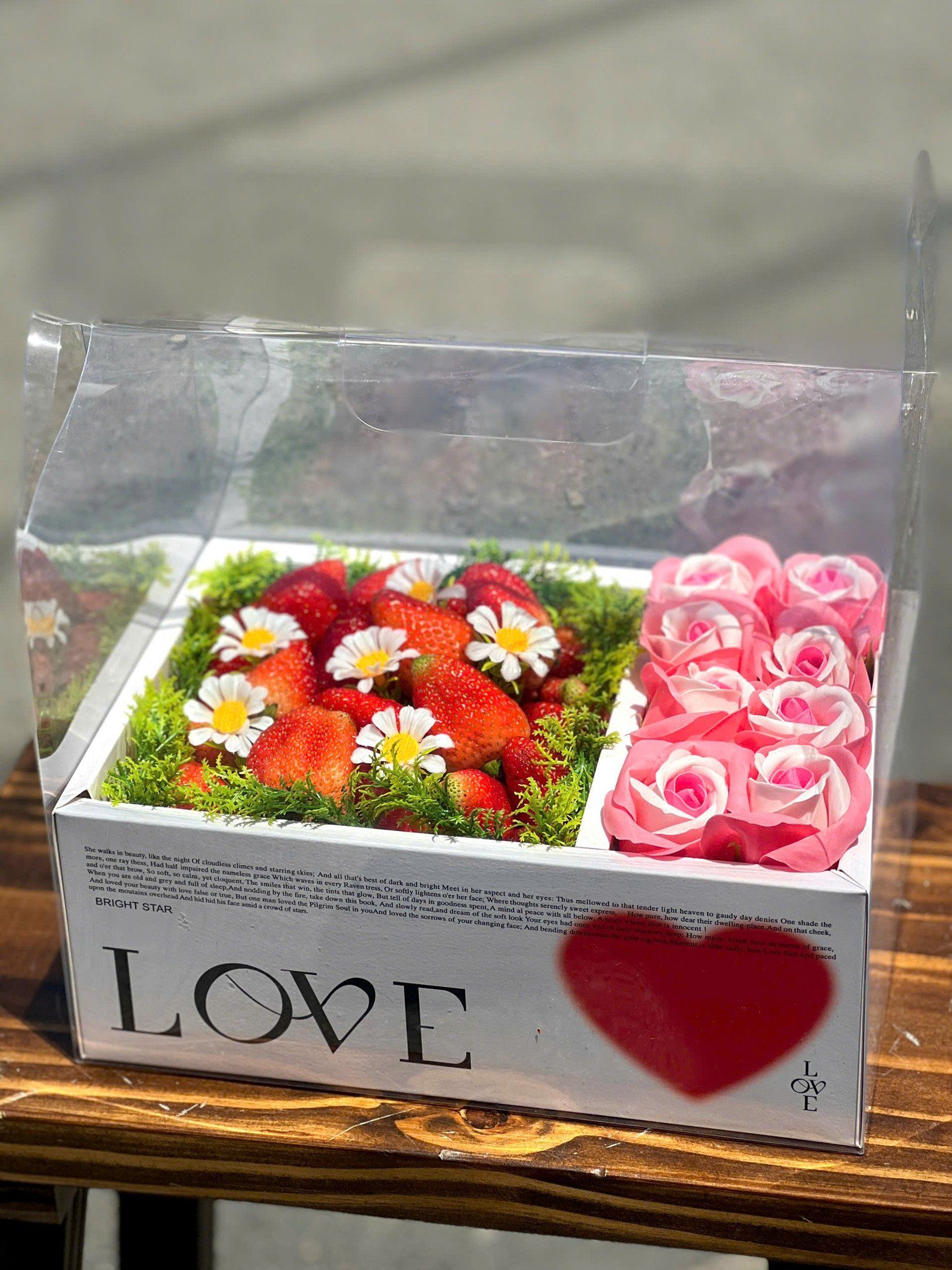 Dâu tây tươi và hoa hồng được chọn lựa kỹ lưỡng, đảm bảo tươi ngon, đẹp mắt và tinh tế.
