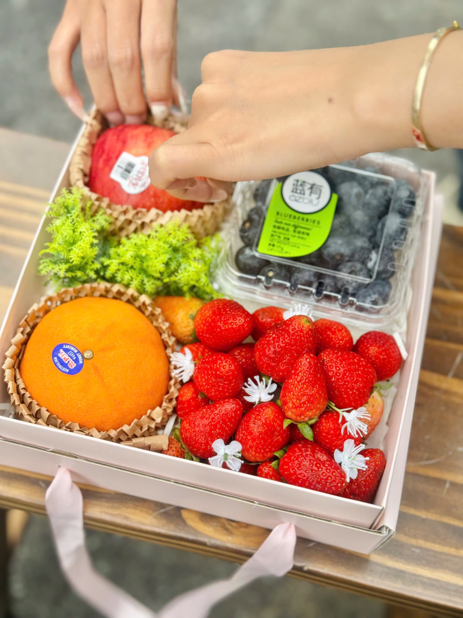 Thành phần: Dâu tây Đà Lạt, Táo Envy New Zealand, Quýt Úc tươi, Việt quất Peru 125g, Hoa hồng, Thiệp chúc.