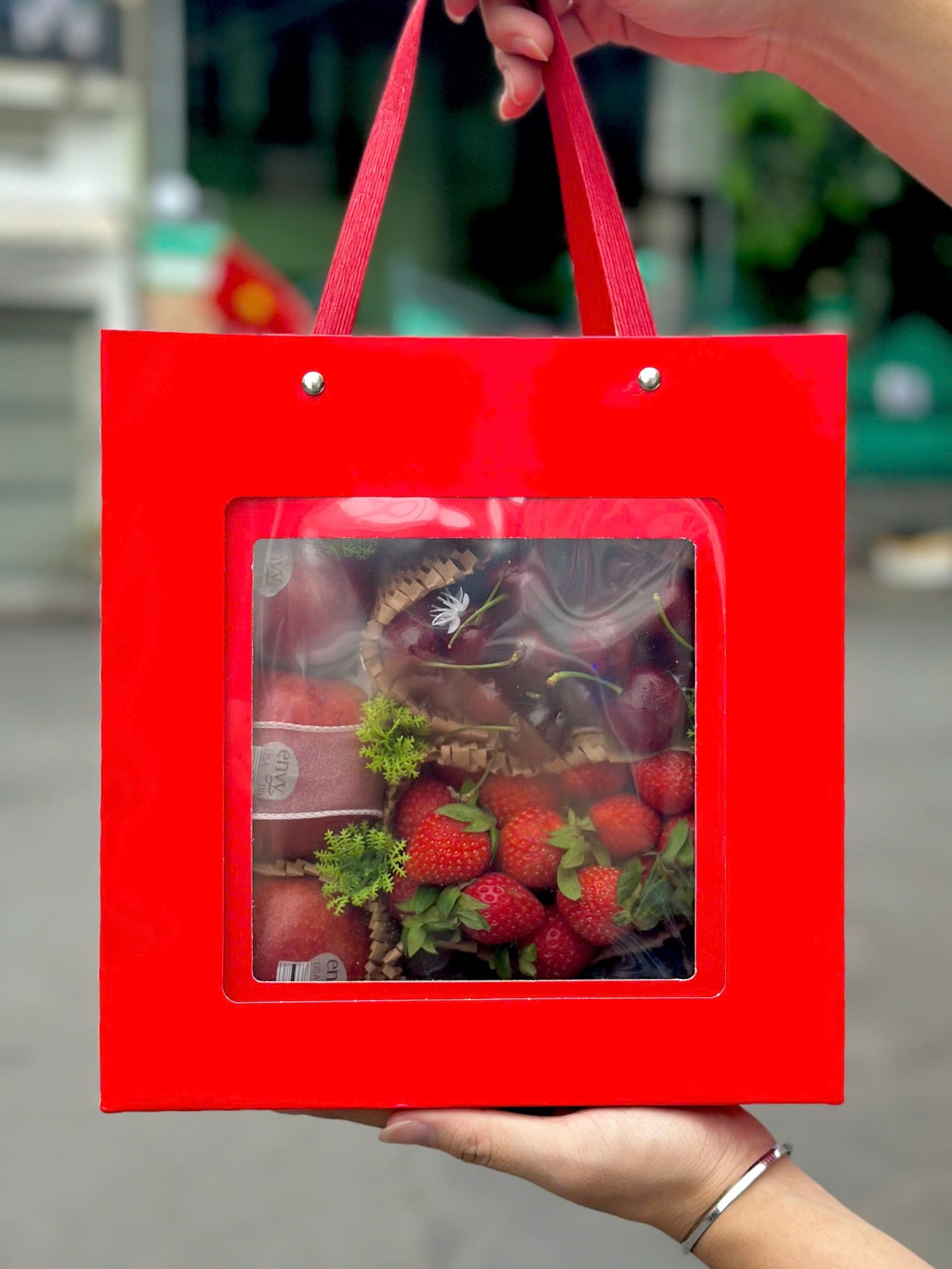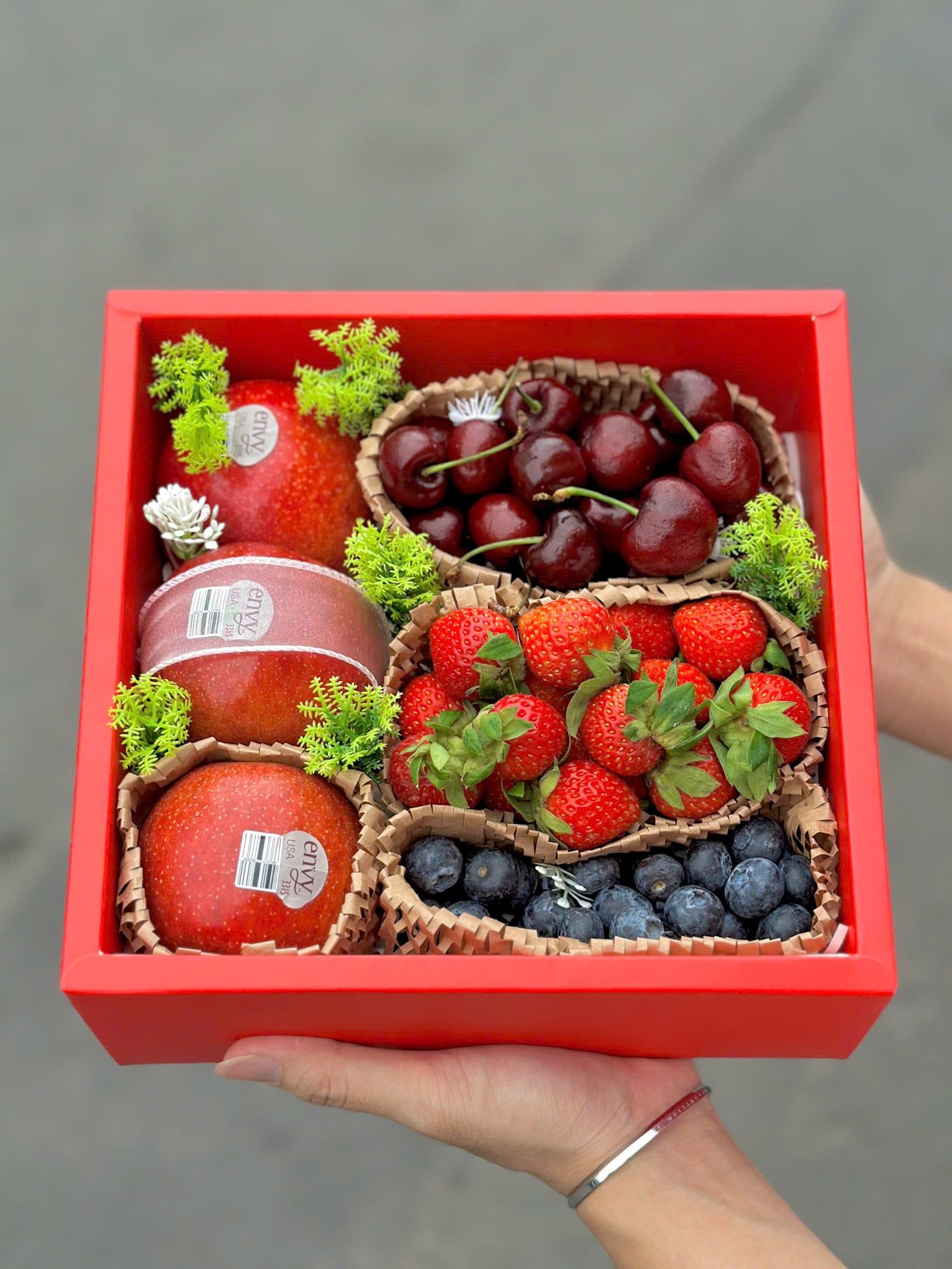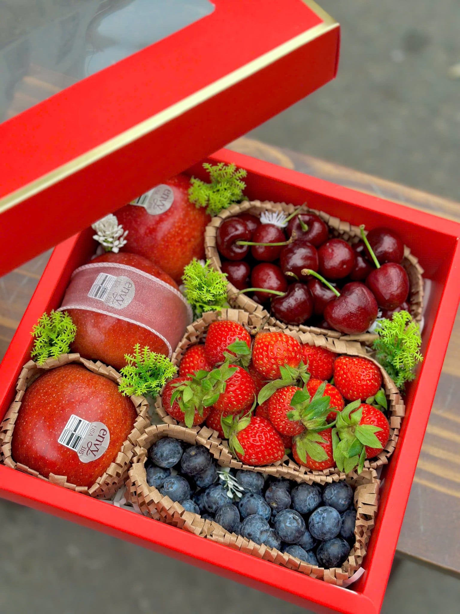Mỗi loại trái cây là một lời chúc: cherry cho yêu thương trọn vẹn, táo cho sự quan tâm bền lâu, dâu tây cho cảm xúc lãng mạn, việt quất cho sự tươi mới
