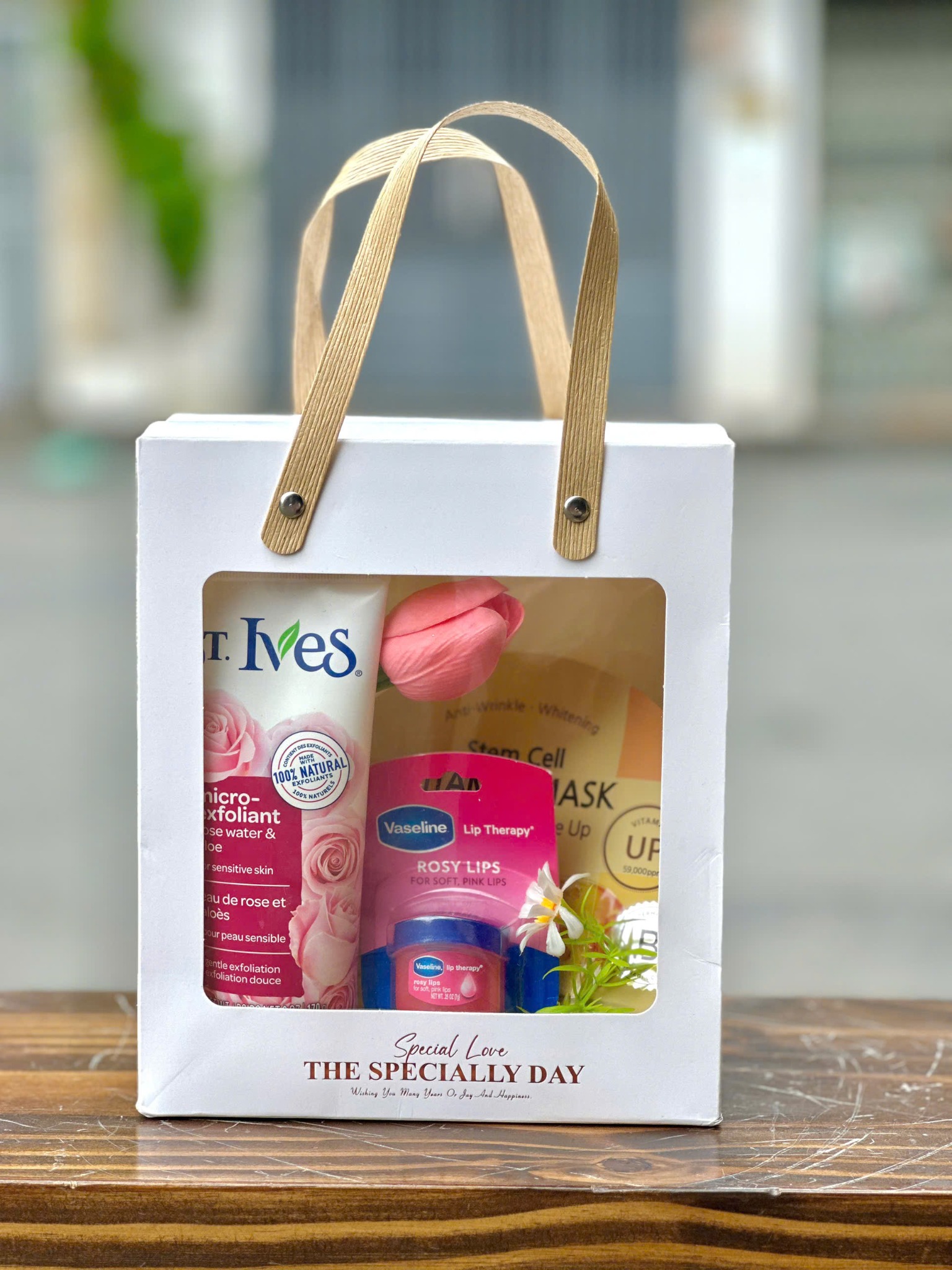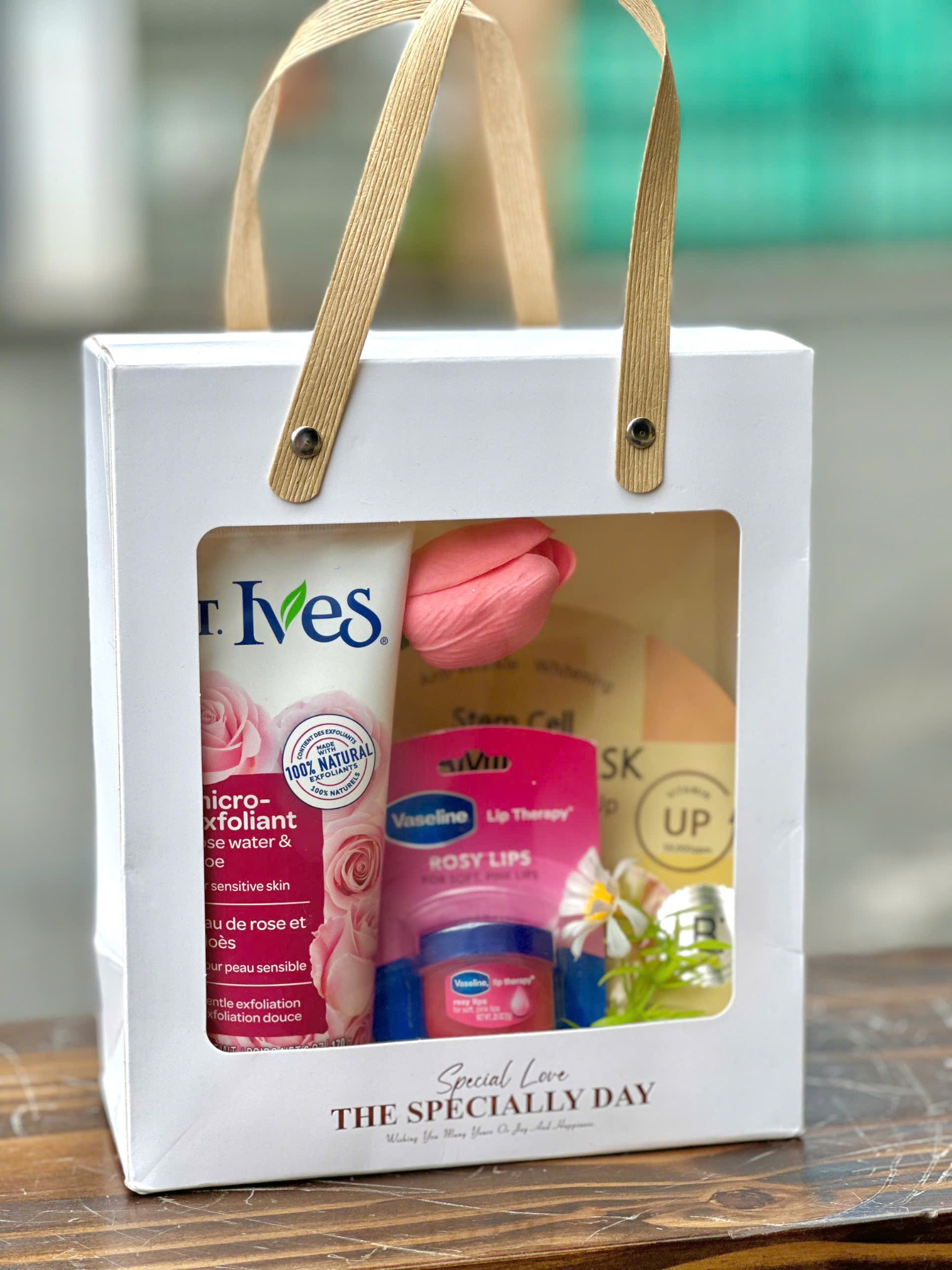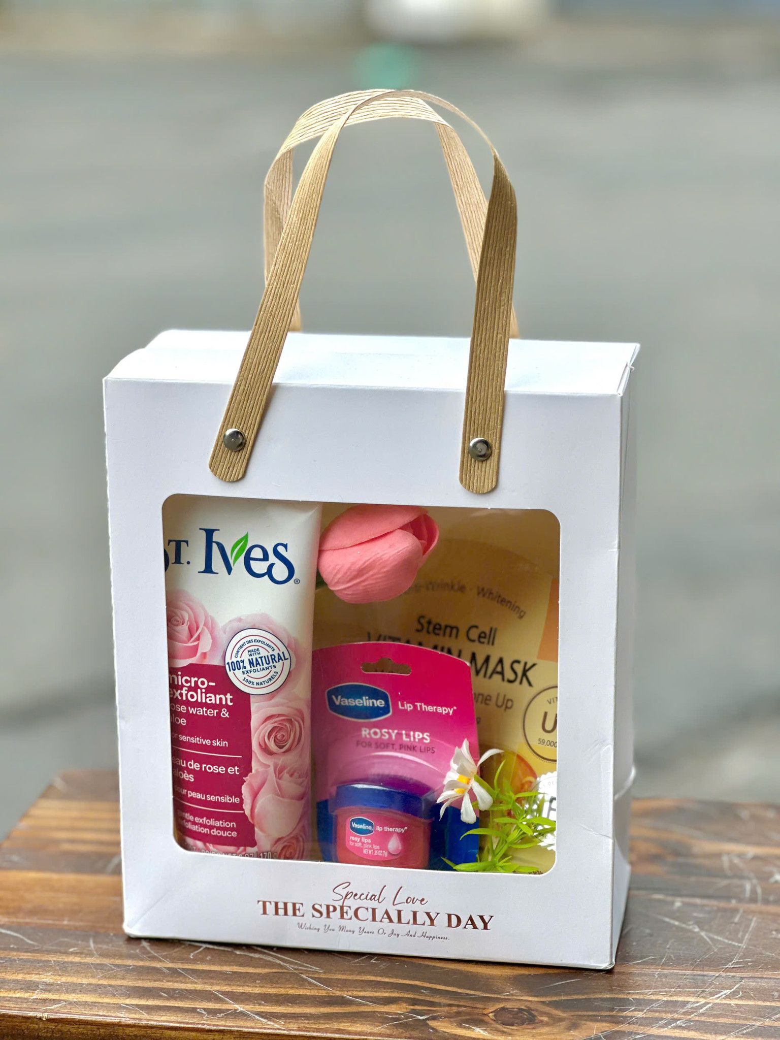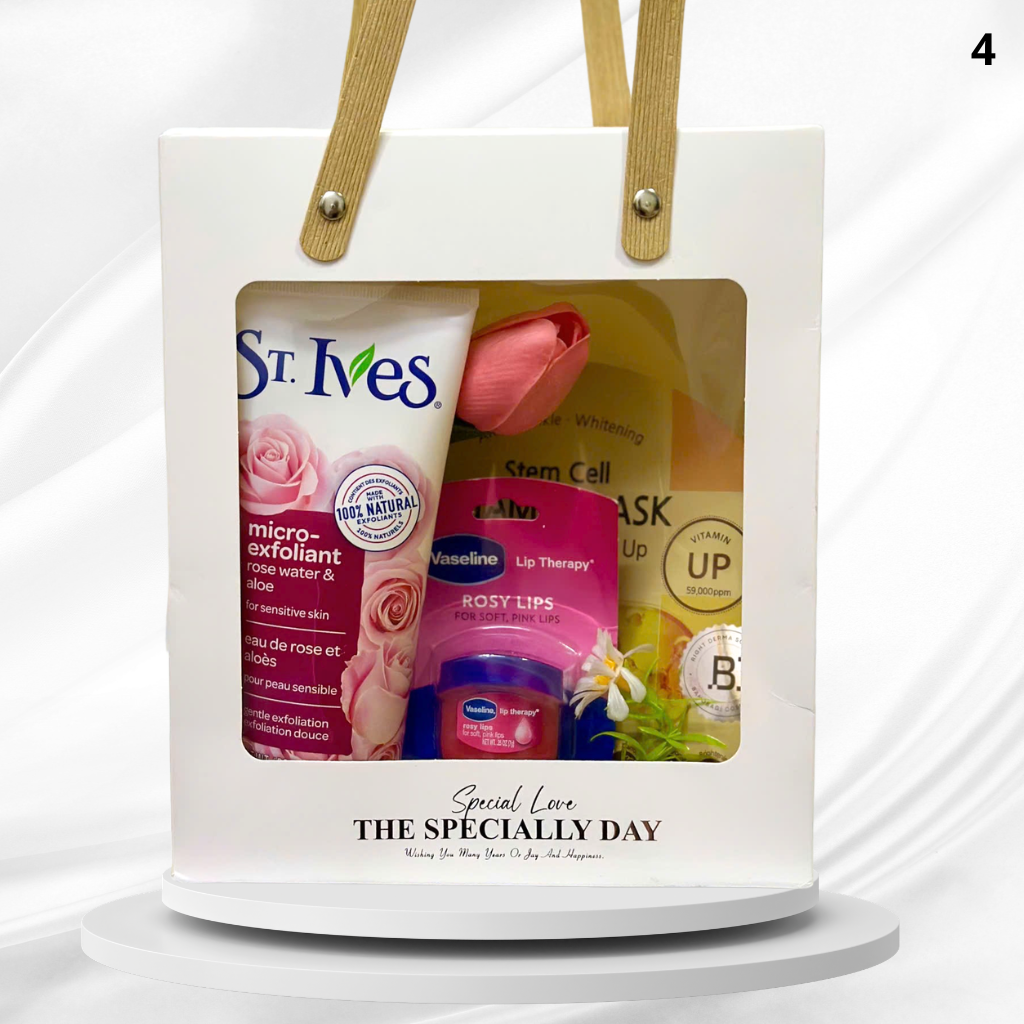 Thành phần: Mặt nạ BANOBAGI Stem Cell (1 miếng), Dưỡng môi Vaseline hồng 7g, Sữa rửa mặt tẩy tế bào chết St. Ives 170g