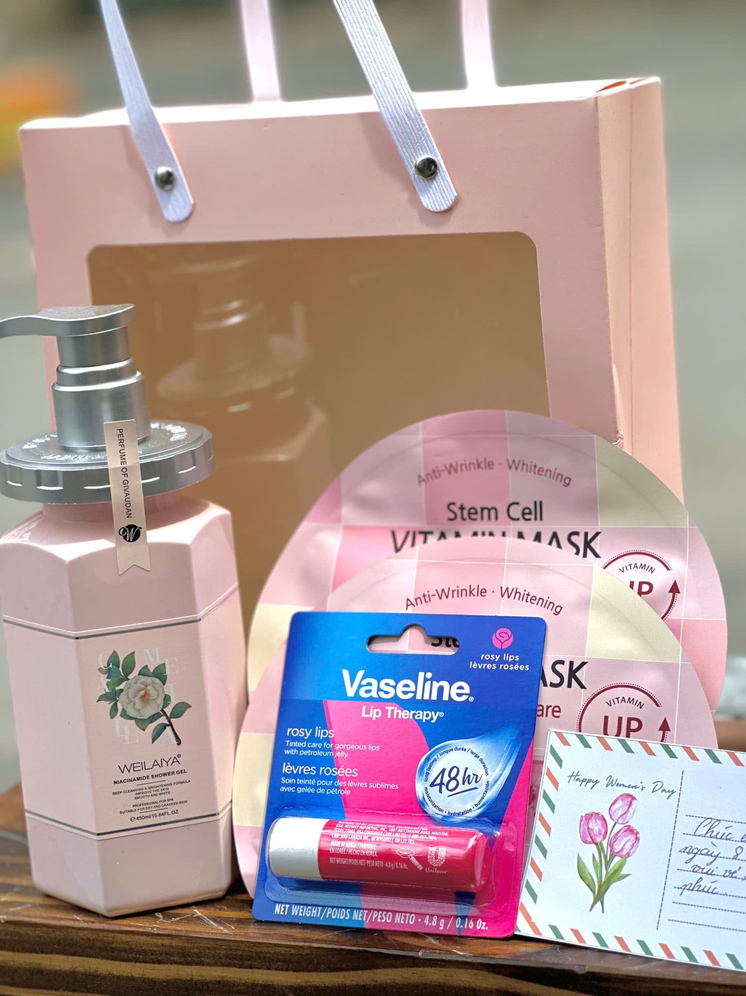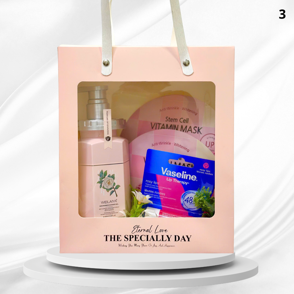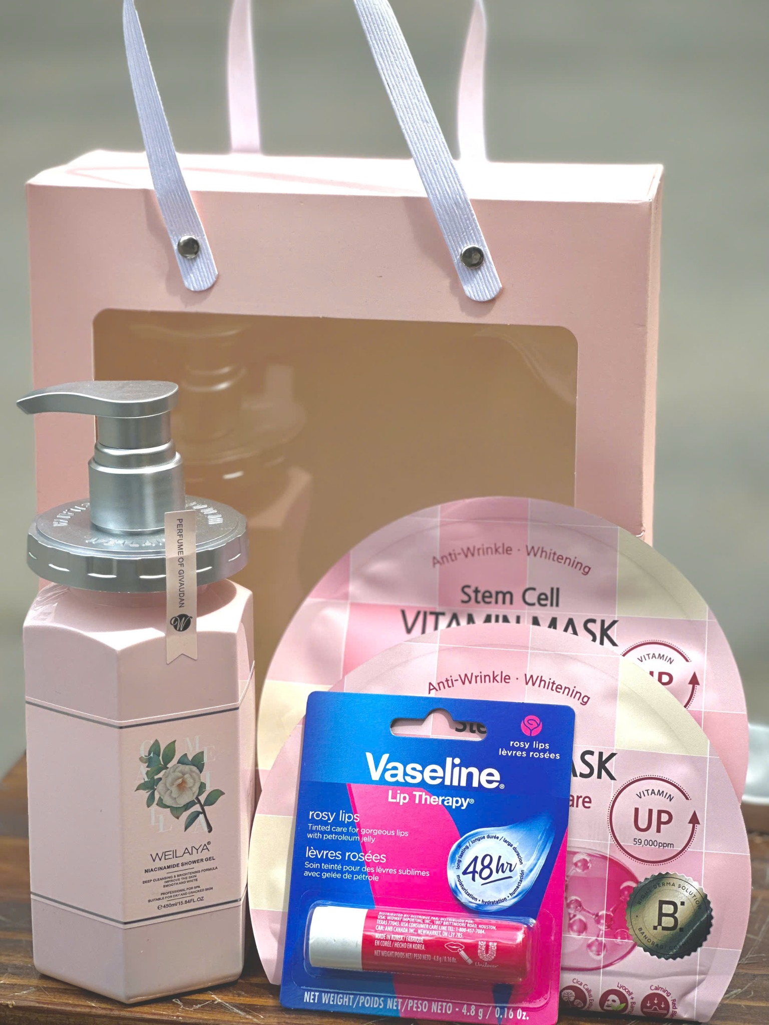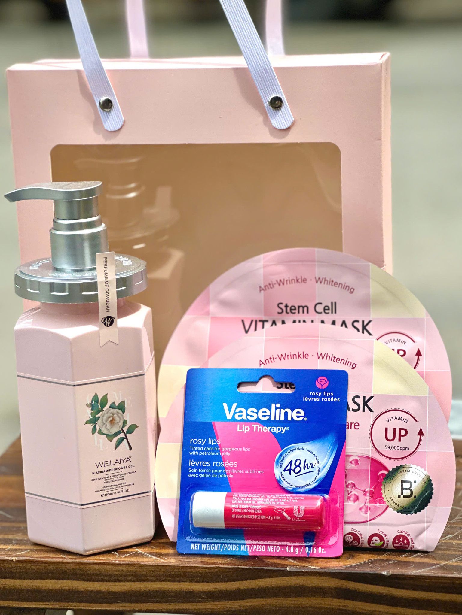 Thành phần: Son dưỡng môi Vaseline Rosy Lips 4.8g, Mặt nạ BANOBAGI Stem Cell, Sữa tắm Weilaiya hương nước hoa Hoa Trà 450ml