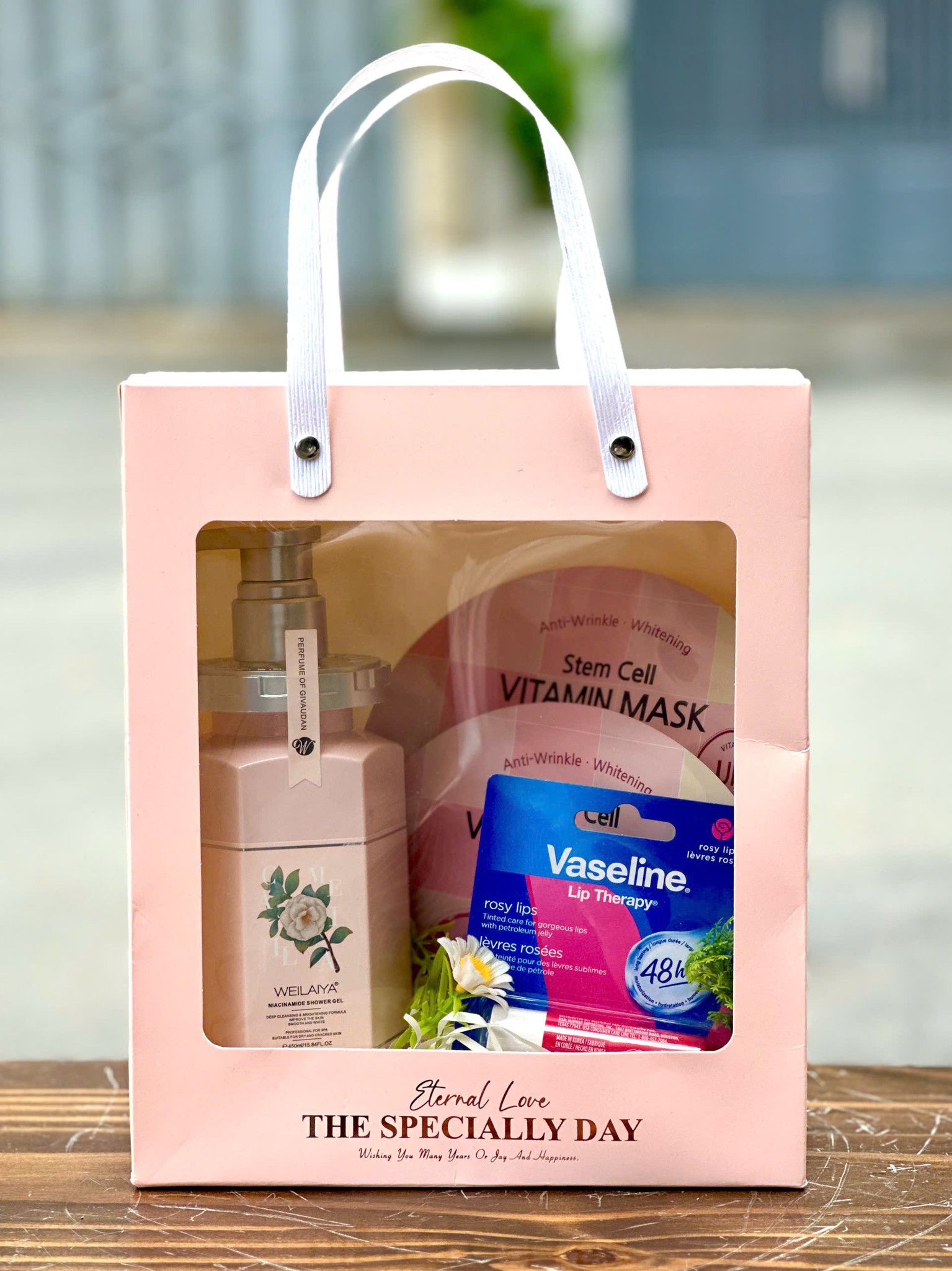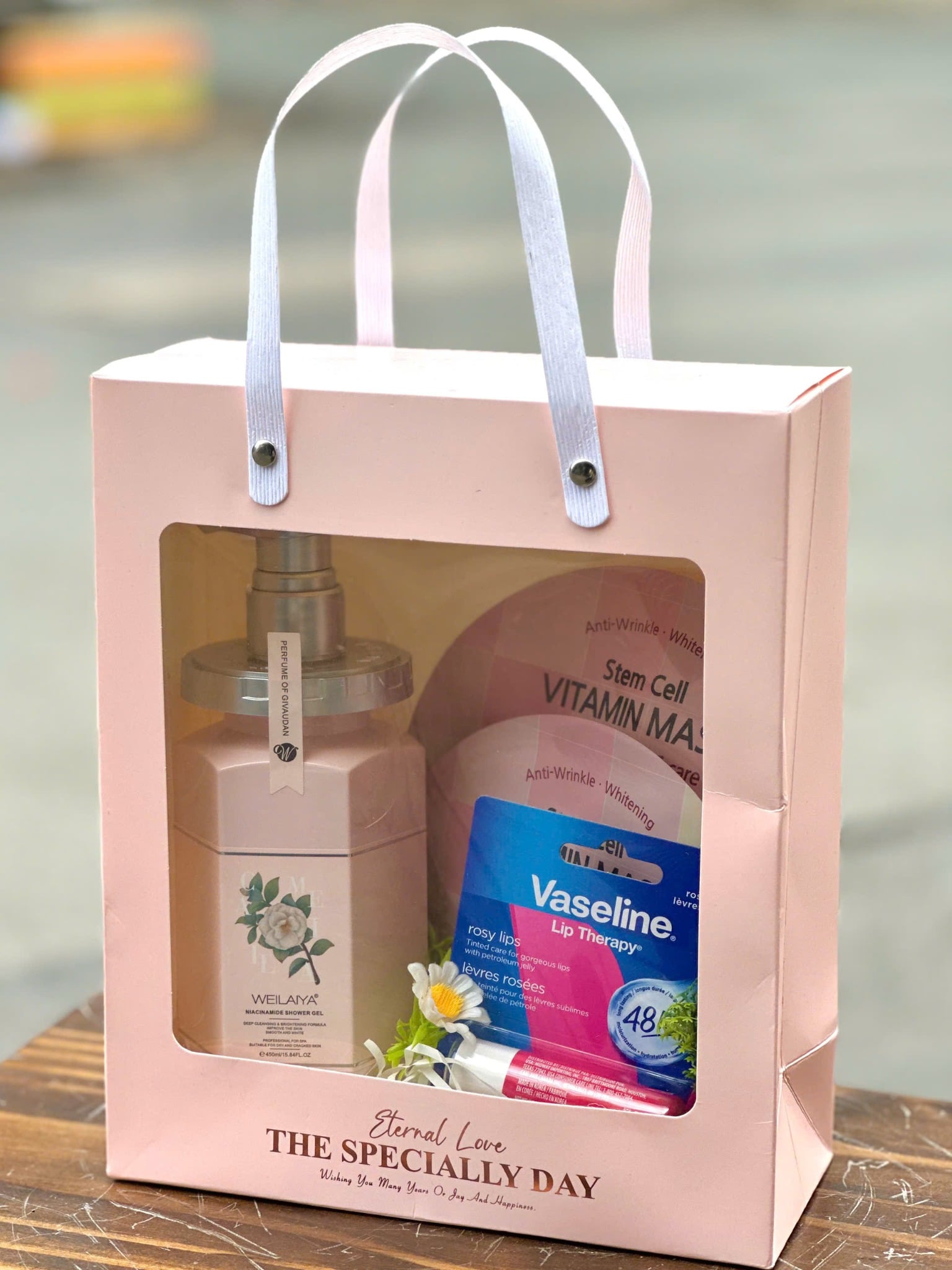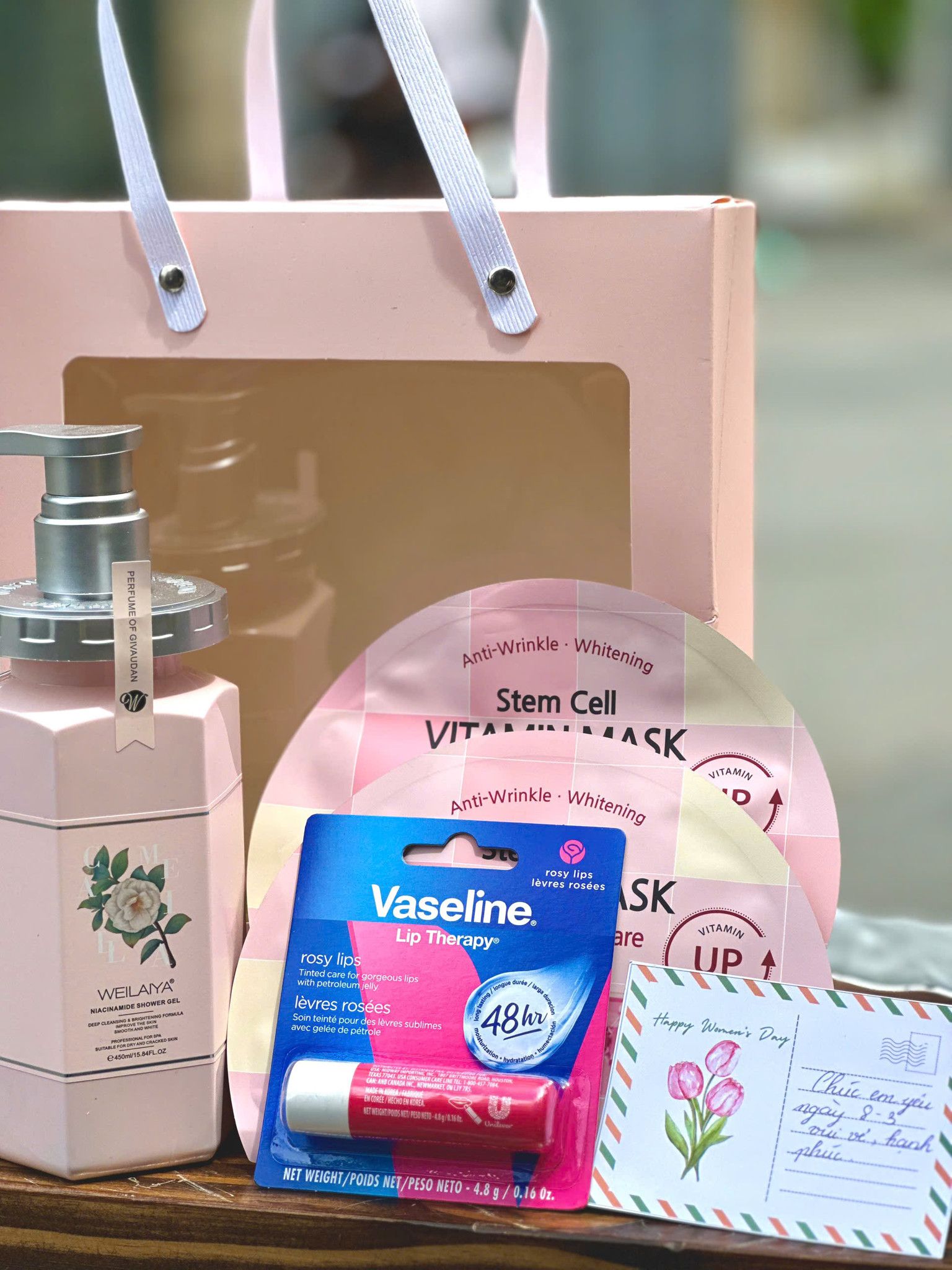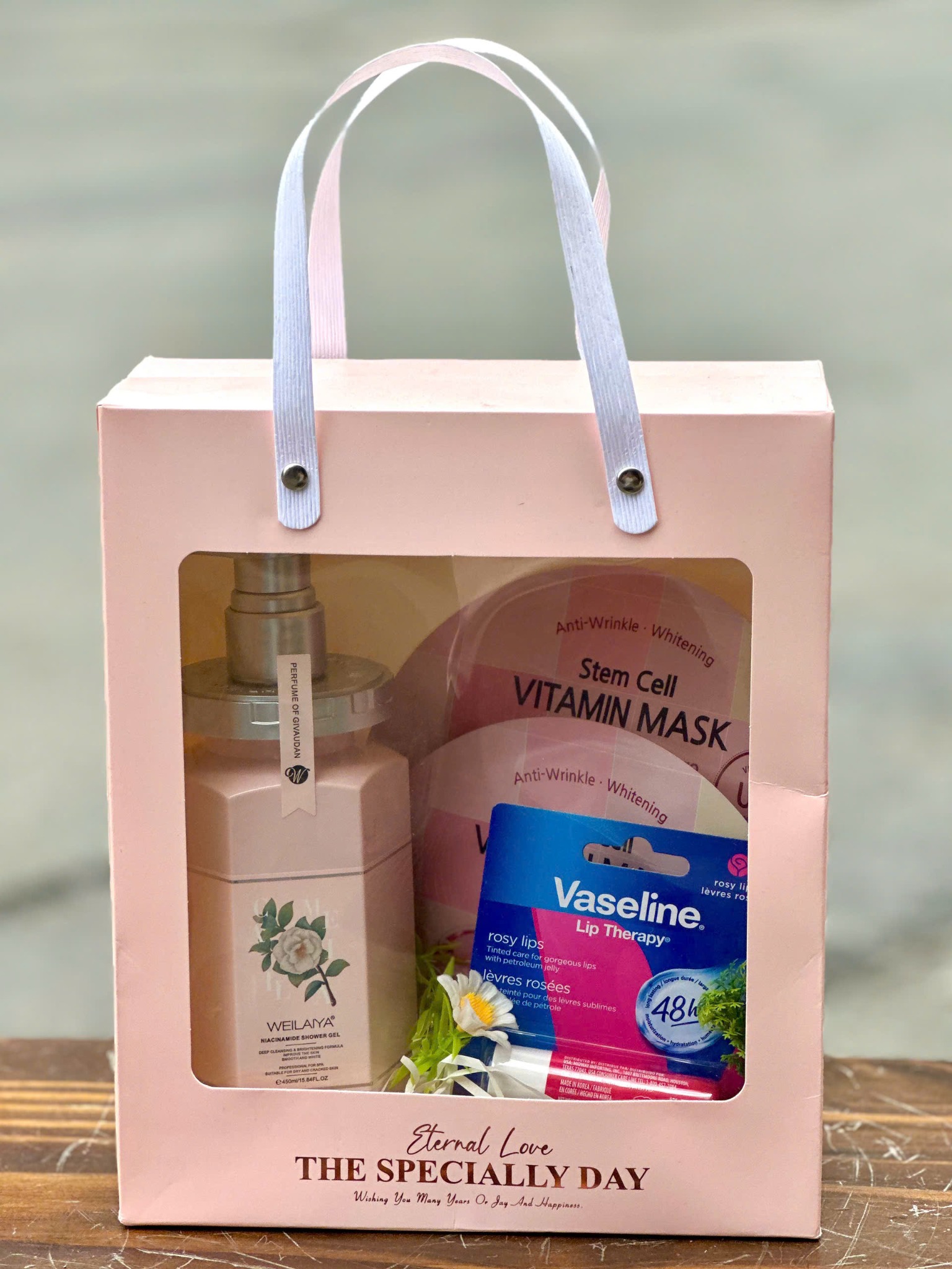 Thành phần: Son dưỡng môi Vaseline Rosy Lips 4.8g, Mặt nạ BANOBAGI Stem Cell, Sữa tắm Weilaiya hương nước hoa Hoa Trà 450ml